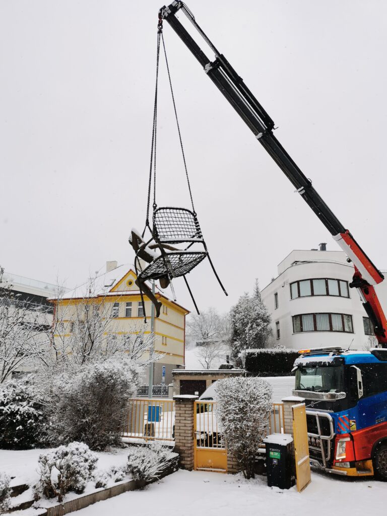 Stěhovala se ikonická dívka na židli, sochy trpaslíků, plastika srdce, hlava, zdravice a další objekty, které byly rozmístěny po celé zahradě. Některé plastiky byly subtilní, jiné naopak rozměrné a těžké, což znamenalo kombinovat ruční práci s profesionální technikou. Každý předmět jsme nejprve pečlivě připravili, zajistili ochrannými materiály a fixovali tak, aby byl transport bezpečný i při manipulaci v nerovném terénu zasněžené zahrady. Právě podobné detaily rozhodují o tom, zda stěhování proběhne hladce a bez rizika.